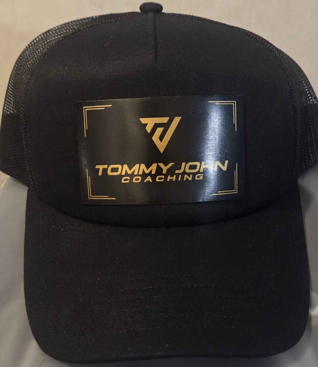 Custom PU leatherette laser engraved with the Tommy John logo to have the gold text come through